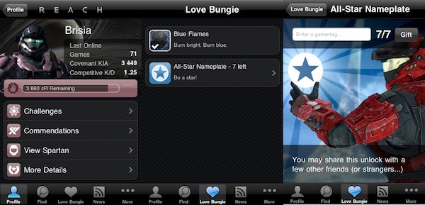 Los usuarios con iPhone, iPad o iPod Touch que cuenten con el iOS 4 o una versión más actualizada podrán recibir el casco de llamas azules y una placa o nameplate All-Star (marca de agua que aparece al lado de tu gamertag y tu rango) para el juego de Halo: Reach a través de la nueva aplicación de Bungie.