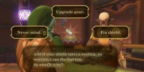 En esta edición existe la opción de regresar a Skyloft, al bazar para hacer «upgrades» a nuestros items. Por ejemplo: el escudo inicial es de madera y se va desgastando hasta romperse (se indica su «desgaste» en una barrita) y en escenarios con fuego, éste no resiste. Para eso debemos actualizarlo pagando una módica cantidad de rupias y de diversos «items monetarios» (no se cómo llamarlos pero son pequeños tesoros) que encontramos a través del juego en pasto, cavando o nos los darán los enemigos al vencerlos.
