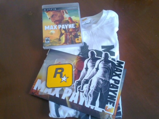 Juego de Max Payne 3, Playera oficial de Rockstar Games y Stickers de Max Payne 3 y un libro promocional.